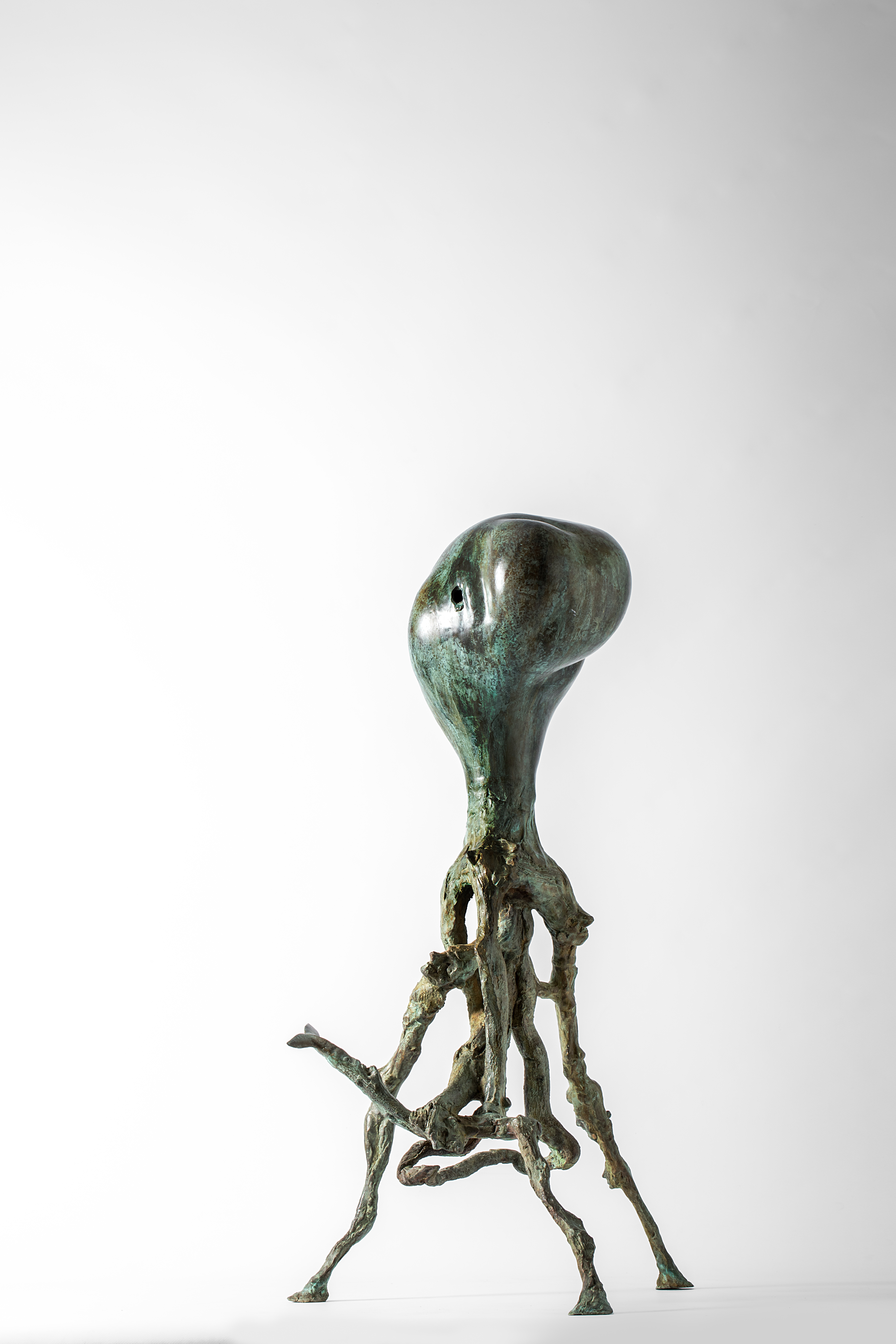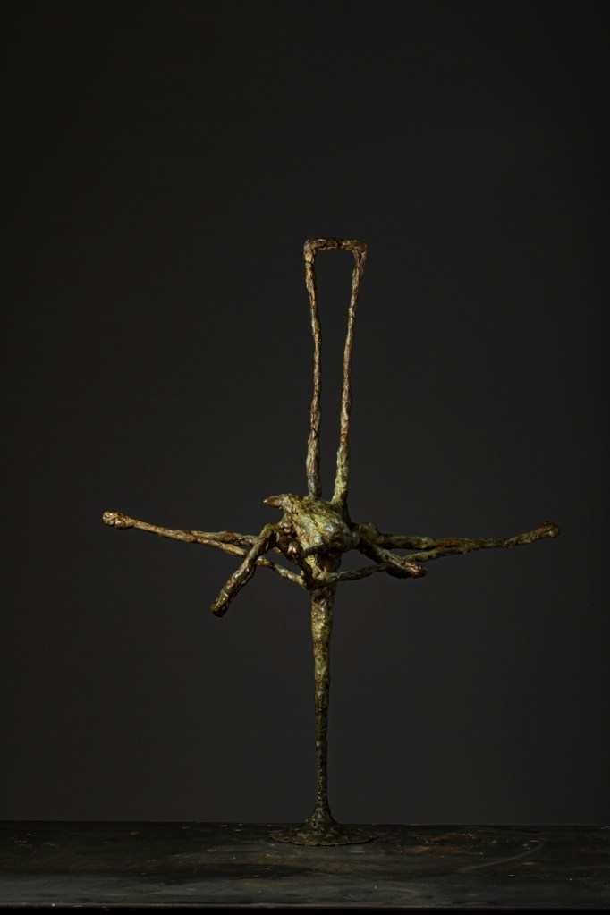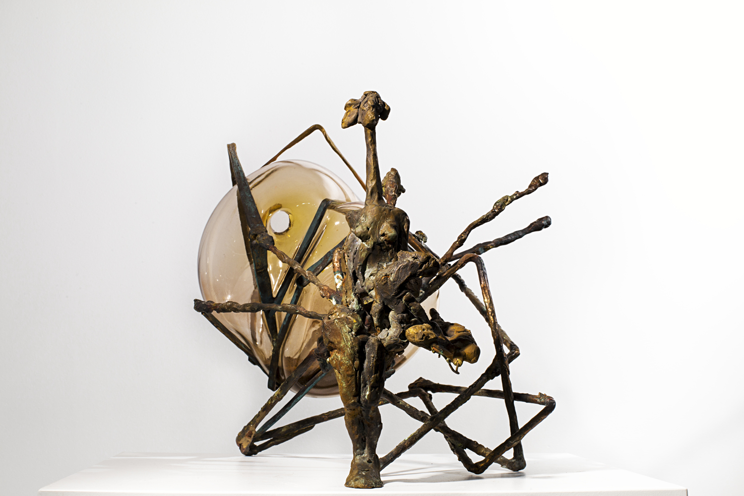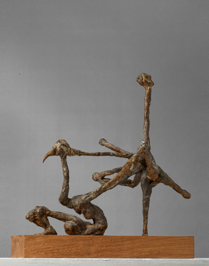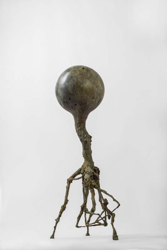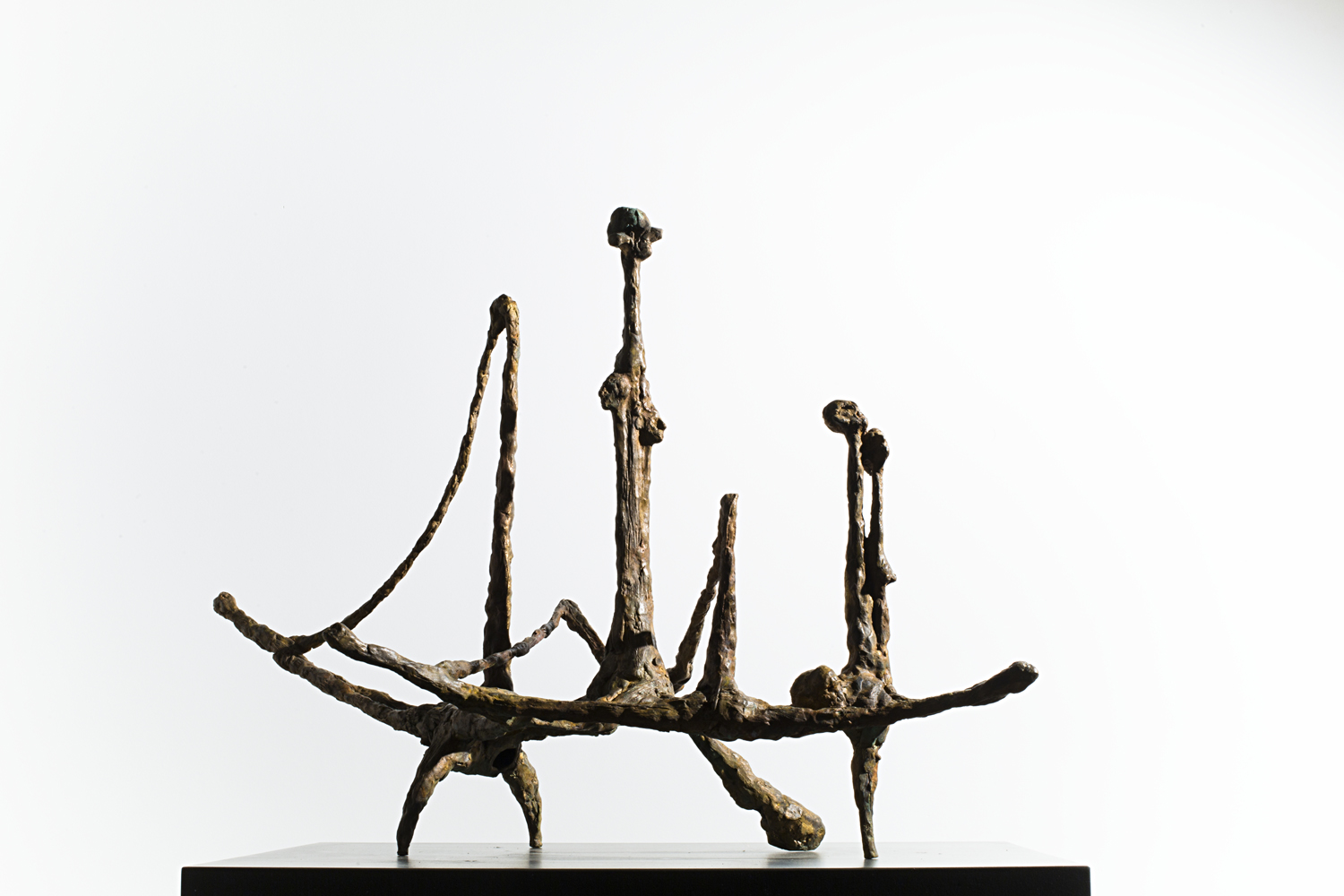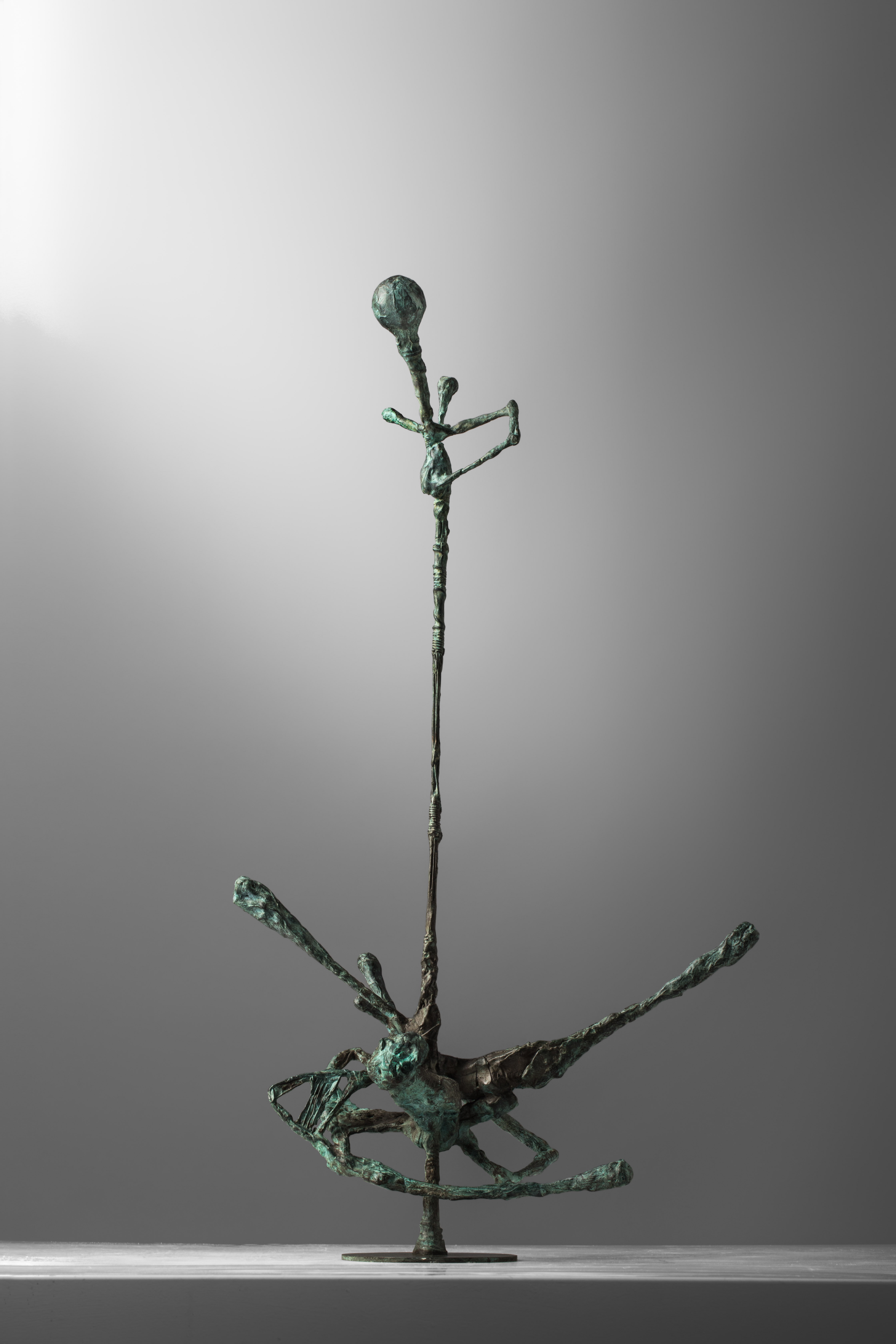 Organized along vertical and horizontal axes, the sculptures create areas of density and sparseness that emerge from the modulation of mass and the interweaving of form in space. Their forms develop linearly, conveying the energies of the shapes and culminating in miniature anthropomorphic or osteomorphic terminations. Through their movement, they define a permeable space of shifting formal relationships, perceived as a vital space of the forms.